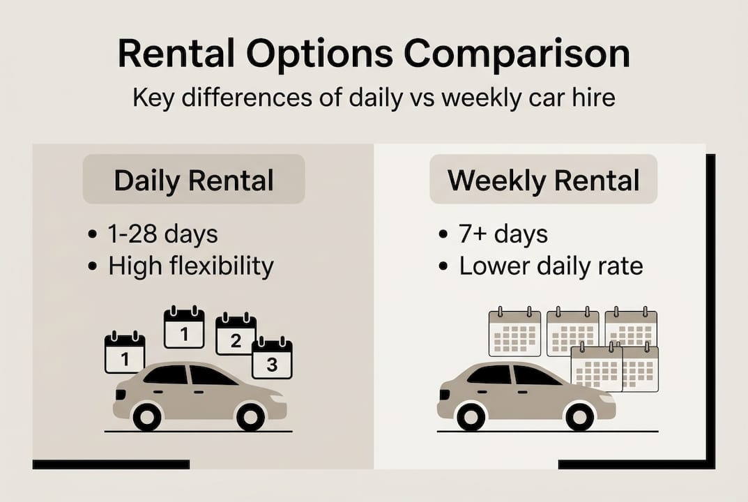 For a more detailed breakdown, the guide on short term vs long term car rental covers the trade-offs clearly. If you're leaning towards a week-long hire, the weekly rental advantages article is worth a read too.